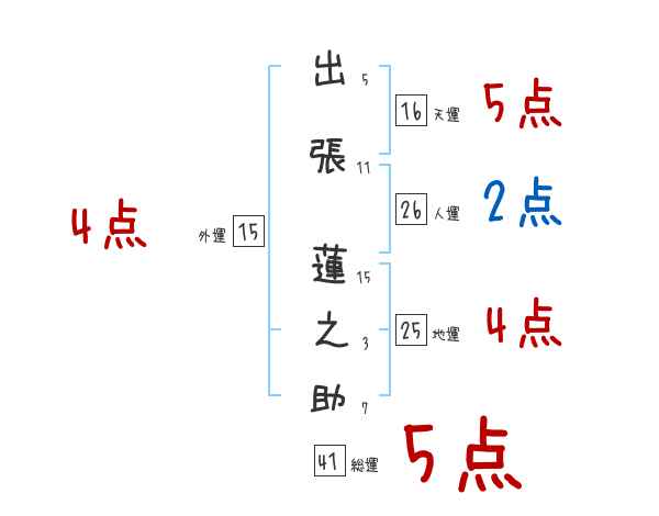 外運![]() | 出張蓮之助さんの外運は15画の4つ星!人徳があり出世する。順調に物事を進め円満な人生。 生活面を象徴する運勢です。外部から受ける影響力を表し、結婚運、家庭運や職場、環境への順応性を表します。 |