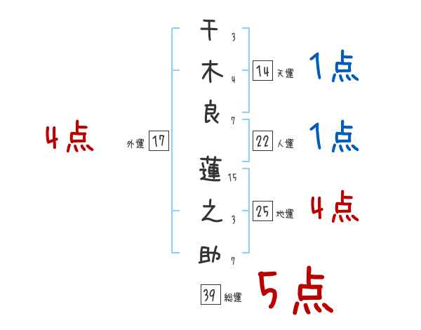 外運![]() | 千木良蓮之助さんの外運は17画の4つ星!積極的な行動力。地位を気づき財産を手に入れる。純粋な心と直感力。 生活面を象徴する運勢です。外部から受ける影響力を表し、結婚運、家庭運や職場、環境への順応性を表します。 |