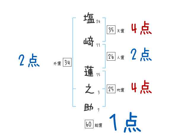 外運![]() | 塩﨑蓮之助さんの外運は34画の2つ星!独創性に優れるが、自尊心が強く災難に注意しましょう。 生活面を象徴する運勢です。外部から受ける影響力を表し、結婚運、家庭運や職場、環境への順応性を表します。 |