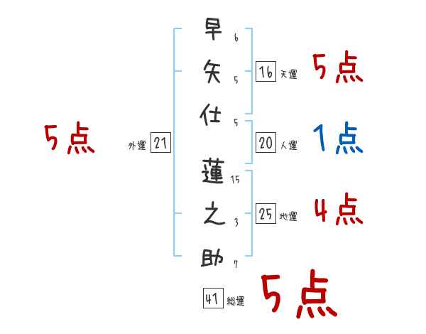 外運![]() | 早矢仕蓮之助さんの外運は21画の5つ星!統率力がある。独立し成功する。名誉を手に入れる。 生活面を象徴する運勢です。外部から受ける影響力を表し、結婚運、家庭運や職場、環境への順応性を表します。 |