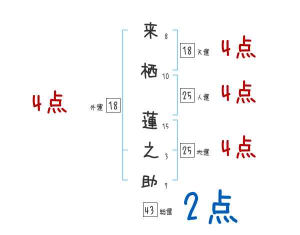 天運![]() | 来栖蓮之助さんの天運は18画の4つ星!情熱的で剛気。忍耐力があり信頼される。 家系が持つ宿命的な運勢を表します。祖先から受け継いだ苗字ですので自分の力が及びません。家柄を象徴します。 |