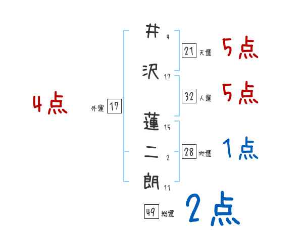 外運![]() | 井沢蓮二朗さんの外運は17画の4つ星!積極的な行動力。地位を気づき財産を手に入れる。純粋な心と直感力。 生活面を象徴する運勢です。外部から受ける影響力を表し、結婚運、家庭運や職場、環境への順応性を表します。 |