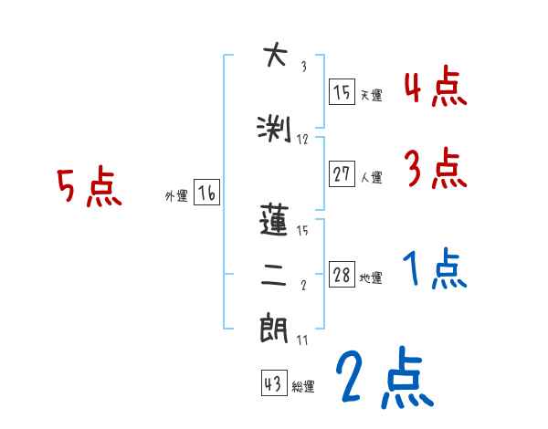 天運![]() | 大渕蓮二朗さんの天運は15画の4つ星!人徳があり出世する。順調に物事を進め円満な人生。 家系が持つ宿命的な運勢を表します。祖先から受け継いだ苗字ですので自分の力が及びません。家柄を象徴します。 |