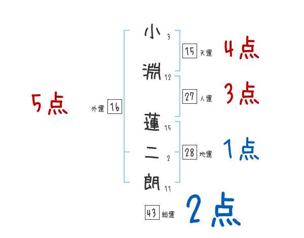 外運![]() | 小淵蓮二朗さんの外運は16画の5つ星!人望が厚く大きく発展する。逆転成功が見える。 生活面を象徴する運勢です。外部から受ける影響力を表し、結婚運、家庭運や職場、環境への順応性を表します。 |