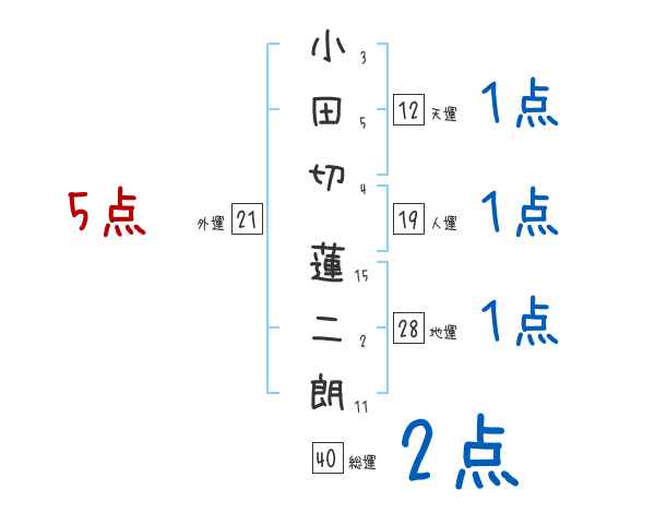 外運![]() | 小田切蓮二朗さんの外運は21画の5つ星!統率力がある。独立し成功する。名誉を手に入れる。 生活面を象徴する運勢です。外部から受ける影響力を表し、結婚運、家庭運や職場、環境への順応性を表します。 |