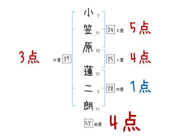 天運![]() | 小笠原蓮二朗さんの天運は24画の5つ星!家庭運が良く順調な人生。金運にも恵まれる。 家系が持つ宿命的な運勢を表します。祖先から受け継いだ苗字ですので自分の力が及びません。家柄を象徴します。 |