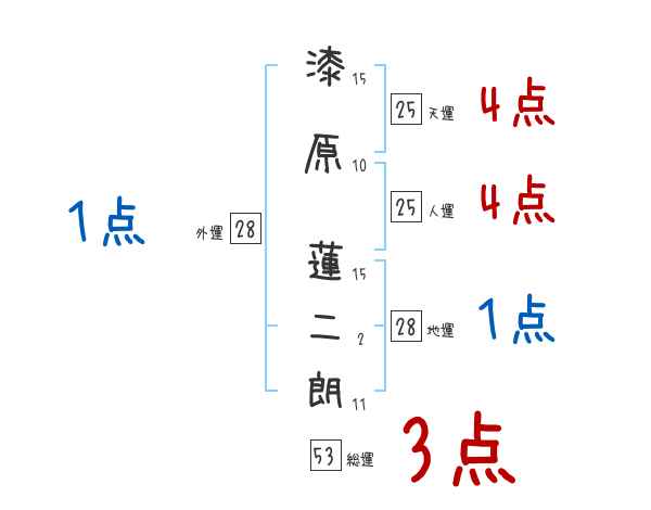 総運![]() | 漆原蓮二朗さんの総運は53画の3つ星!やや見栄っ張りで虚栄心がある。散財に注意。 あなたの人生を表す1番重要な運勢です。生涯を通じて影響する総合運となり、主に50歳以降の晩年期に影響を及ぼします。 |