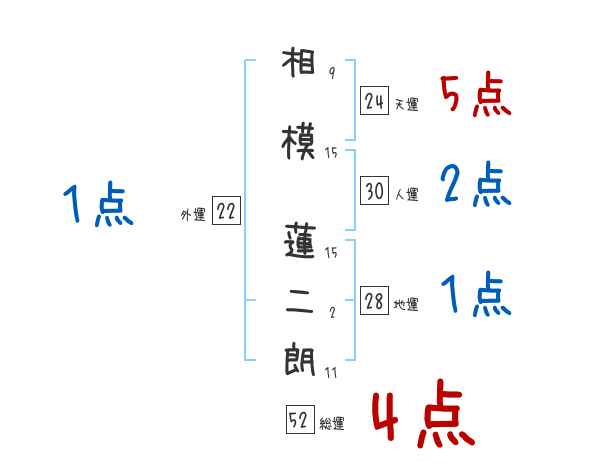 外運![]() | 相模蓮二朗さんの外運は22画の1つ星!努力することが苦手ないっぽう手先が器用。芸術性にも優れる。 生活面を象徴する運勢です。外部から受ける影響力を表し、結婚運、家庭運や職場、環境への順応性を表します。 |