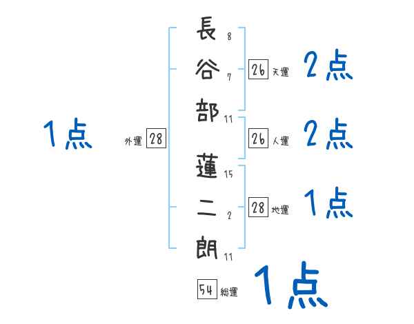 天運![]() | 長谷部蓮二朗さんの天運は26画の2つ星!波瀾万丈かも。信頼できる人を大事にしましょう。 家系が持つ宿命的な運勢を表します。祖先から受け継いだ苗字ですので自分の力が及びません。家柄を象徴します。 |