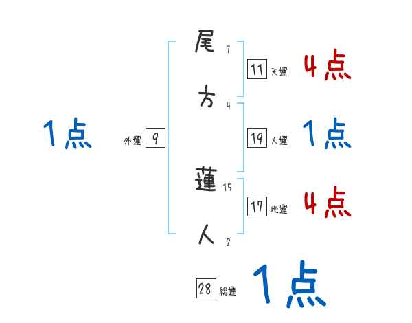 天運![]() | 尾方蓮人さんの天運は11画の4つ星!着実に富や地位を得る幸運な人生。 家系が持つ宿命的な運勢を表します。祖先から受け継いだ苗字ですので自分の力が及びません。家柄を象徴します。 |