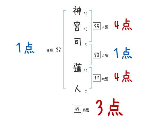 外運![]() | 神宮司蓮人さんの外運は22画の1つ星!努力することが苦手ないっぽう手先が器用。芸術性にも優れる。 生活面を象徴する運勢です。外部から受ける影響力を表し、結婚運、家庭運や職場、環境への順応性を表します。 |