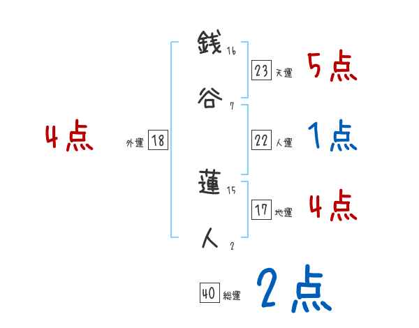 外運![]() | 銭谷蓮人さんの外運は18画の4つ星!情熱的で剛気。忍耐力があり信頼される。 生活面を象徴する運勢です。外部から受ける影響力を表し、結婚運、家庭運や職場、環境への順応性を表します。 |