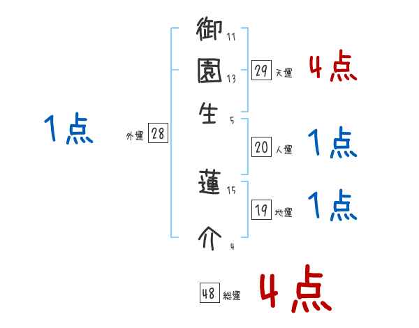 天運![]() | 御園生蓮介さんの天運は29画の4つ星!完全主義で才能がある。厳格な心の持ち主。 家系が持つ宿命的な運勢を表します。祖先から受け継いだ苗字ですので自分の力が及びません。家柄を象徴します。 |