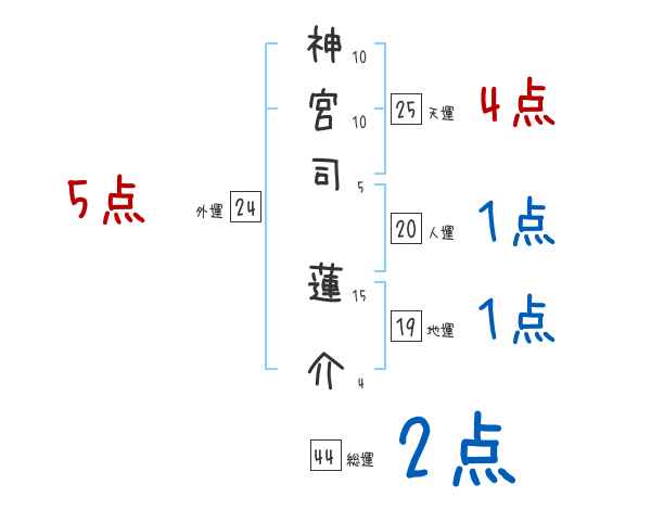 天運![]() | 神宮司蓮介さんの天運は25画の4つ星!個性があり才能があふれる。強運の持ち主で発展する。 家系が持つ宿命的な運勢を表します。祖先から受け継いだ苗字ですので自分の力が及びません。家柄を象徴します。 |