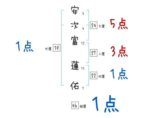 天運![]() | 安次富蓮佑さんの天運は24画の5つ星!家庭運が良く順調な人生。金運にも恵まれる。 家系が持つ宿命的な運勢を表します。祖先から受け継いだ苗字ですので自分の力が及びません。家柄を象徴します。 |