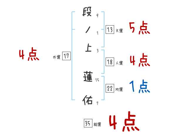 外運![]() | 段ノ上蓮佑さんの外運は17画の4つ星!積極的な行動力。地位を気づき財産を手に入れる。純粋な心と直感力。 生活面を象徴する運勢です。外部から受ける影響力を表し、結婚運、家庭運や職場、環境への順応性を表します。 |