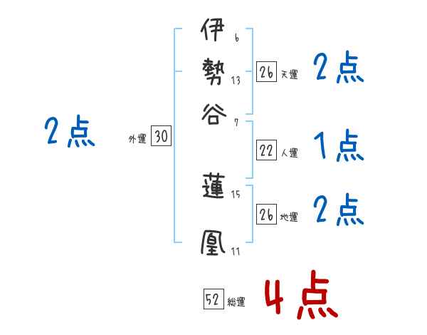 天運![]() | 伊勢谷蓮凰さんの天運は26画の2つ星!波瀾万丈かも。信頼できる人を大事にしましょう。 家系が持つ宿命的な運勢を表します。祖先から受け継いだ苗字ですので自分の力が及びません。家柄を象徴します。 |
