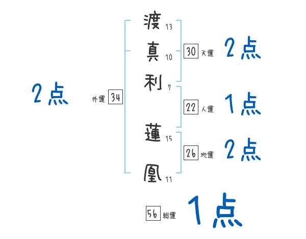 天運![]() | 渡真利蓮凰さんの天運は30画の2つ星!浮き沈みの激しさに注意しましょう。 家系が持つ宿命的な運勢を表します。祖先から受け継いだ苗字ですので自分の力が及びません。家柄を象徴します。 |