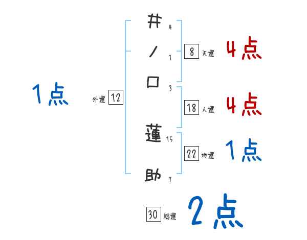 天運![]() | 井ノ口蓮助さんの天運は8画の4つ星!勤勉家。根気強く努力し成功する。忍耐力がある。 家系が持つ宿命的な運勢を表します。祖先から受け継いだ苗字ですので自分の力が及びません。家柄を象徴します。 |