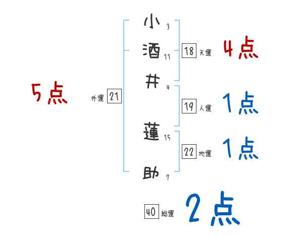外運![]() | 小酒井蓮助さんの外運は21画の5つ星!統率力がある。独立し成功する。名誉を手に入れる。 生活面を象徴する運勢です。外部から受ける影響力を表し、結婚運、家庭運や職場、環境への順応性を表します。 |