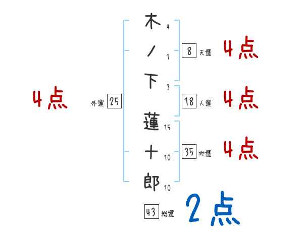 総運![]() | 木ノ下蓮十郎さんの総運は43画の2つ星!頑固な性格で独立心が強いかも。やや非現実的で浪費に注意しましょう。 あなたの人生を表す1番重要な運勢です。生涯を通じて影響する総合運となり、主に50歳以降の晩年期に影響を及ぼします。 |