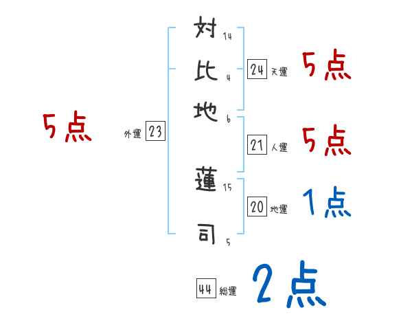 外運![]() | 対比地蓮司さんの外運は23画の5つ星!想像力に優れ活力がある。一代で成功し名誉を手に入れる。 生活面を象徴する運勢です。外部から受ける影響力を表し、結婚運、家庭運や職場、環境への順応性を表します。 |