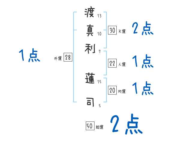 天運![]() | 渡真利蓮司さんの天運は30画の2つ星!浮き沈みの激しさに注意しましょう。 家系が持つ宿命的な運勢を表します。祖先から受け継いだ苗字ですので自分の力が及びません。家柄を象徴します。 |