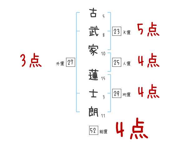 天運![]() | 古武家蓮士朗さんの天運は23画の5つ星!想像力に優れ活力がある。一代で成功し名誉を手に入れる。 家系が持つ宿命的な運勢を表します。祖先から受け継いだ苗字ですので自分の力が及びません。家柄を象徴します。 |