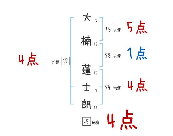 外運![]() | 大楠蓮士朗さんの外運は17画の4つ星!積極的な行動力。地位を気づき財産を手に入れる。純粋な心と直感力。 生活面を象徴する運勢です。外部から受ける影響力を表し、結婚運、家庭運や職場、環境への順応性を表します。 |