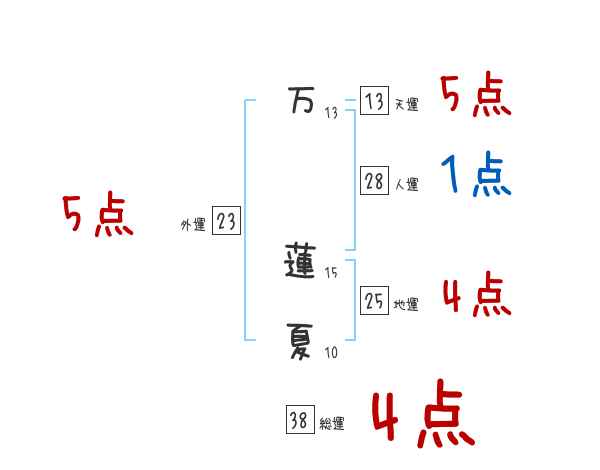 天運![]() | 万蓮夏さんの天運は13画の5つ星!才能に恵まれ人気がある。名声を手に入れる。円満な人生。 家系が持つ宿命的な運勢を表します。祖先から受け継いだ苗字ですので自分の力が及びません。家柄を象徴します。 |