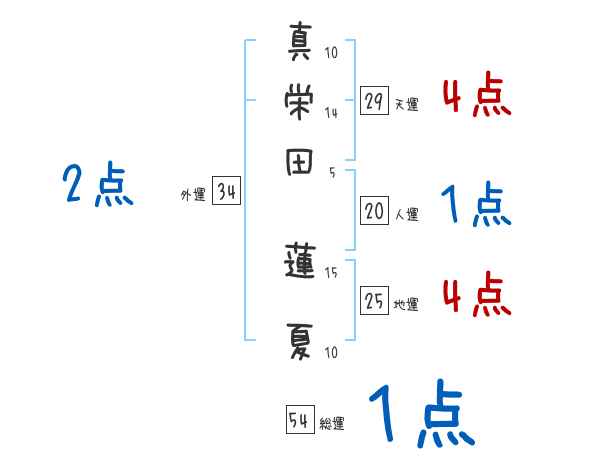 天運![]() | 真栄田蓮夏さんの天運は29画の4つ星!完全主義で才能がある。厳格な心の持ち主。 家系が持つ宿命的な運勢を表します。祖先から受け継いだ苗字ですので自分の力が及びません。家柄を象徴します。 |