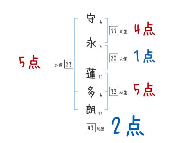 外運![]() | 守永蓮多朗さんの外運は23画の5つ星!想像力に優れ活力がある。一代で成功し名誉を手に入れる。 生活面を象徴する運勢です。外部から受ける影響力を表し、結婚運、家庭運や職場、環境への順応性を表します。 |