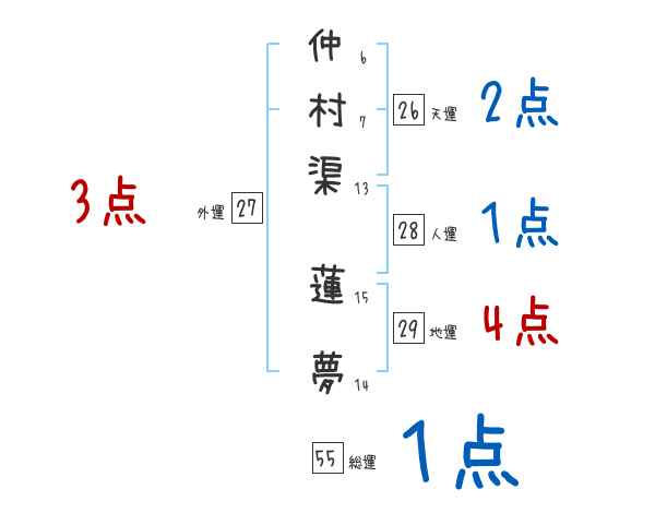 天運![]() | 仲村渠蓮夢さんの天運は26画の2つ星!波瀾万丈かも。信頼できる人を大事にしましょう。 家系が持つ宿命的な運勢を表します。祖先から受け継いだ苗字ですので自分の力が及びません。家柄を象徴します。 |