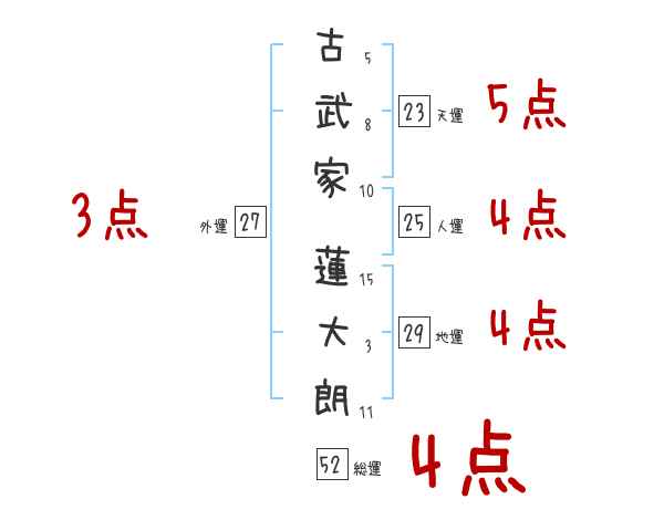 天運![]() | 古武家蓮大朗さんの天運は23画の5つ星!想像力に優れ活力がある。一代で成功し名誉を手に入れる。 家系が持つ宿命的な運勢を表します。祖先から受け継いだ苗字ですので自分の力が及びません。家柄を象徴します。 |