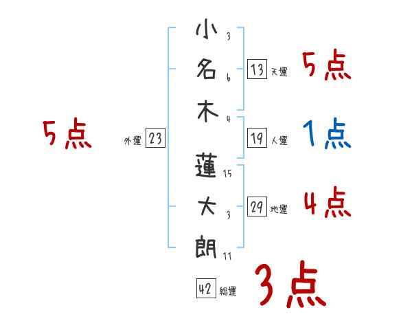 天運![]() | 小名木蓮大朗さんの天運は13画の5つ星!才能に恵まれ人気がある。名声を手に入れる。円満な人生。 家系が持つ宿命的な運勢を表します。祖先から受け継いだ苗字ですので自分の力が及びません。家柄を象徴します。 |