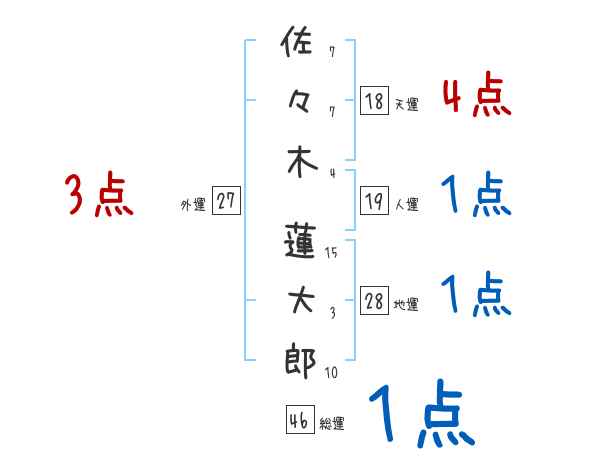 天運![]() | 佐々木蓮大郎さんの天運は18画の4つ星!情熱的で剛気。忍耐力があり信頼される。 家系が持つ宿命的な運勢を表します。祖先から受け継いだ苗字ですので自分の力が及びません。家柄を象徴します。 |