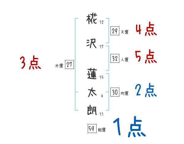 人運![]() | 椛沢蓮太朗さんの人運は32画の5つ星!柔軟性があり成功する。チャンスが多く金運が良い。 性格や才能などを表す2番目に重要な運勢です。人間関係や協調性、社会的な成功に影響します。主に20歳から50歳ぐらいまでの中年期の運勢を表します。 |