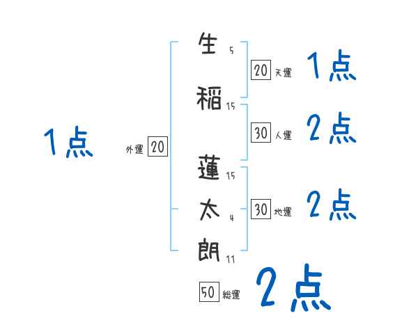 人運![]() | 生稲蓮太朗さんの人運は30画の2つ星!浮き沈みの激しさに注意しましょう。 性格や才能などを表す2番目に重要な運勢です。人間関係や協調性、社会的な成功に影響します。主に20歳から50歳ぐらいまでの中年期の運勢を表します。 |