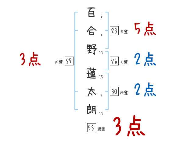 天運![]() | 百合野蓮太朗さんの天運は23画の5つ星!想像力に優れ活力がある。一代で成功し名誉を手に入れる。 家系が持つ宿命的な運勢を表します。祖先から受け継いだ苗字ですので自分の力が及びません。家柄を象徴します。 |