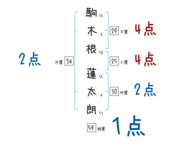 外運![]() | 駒木根蓮太朗さんの外運は34画の2つ星!独創性に優れるが、自尊心が強く災難に注意しましょう。 生活面を象徴する運勢です。外部から受ける影響力を表し、結婚運、家庭運や職場、環境への順応性を表します。 |