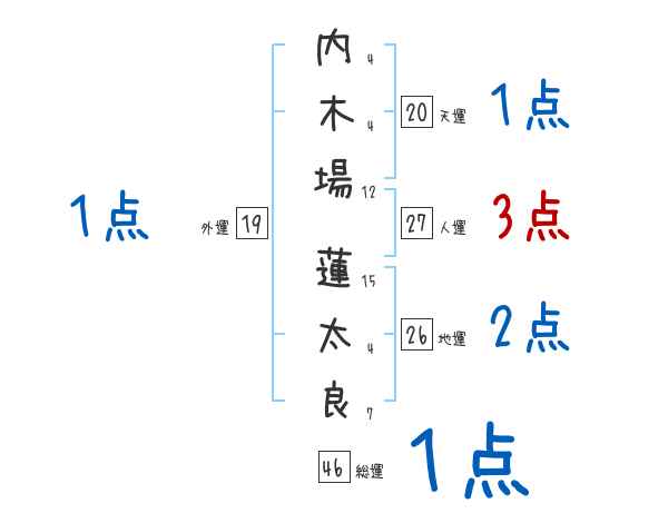 地運![]() | 内木場蓮太良さんの地運は26画の2つ星!波瀾万丈かも。信頼できる人を大事にしましょう。 個性を表す基礎的な運勢です。性格形成や対人関係、行動力など家庭環境に影響されます。主に誕生してから20歳くらいまでの若年期の運勢を表します。 |