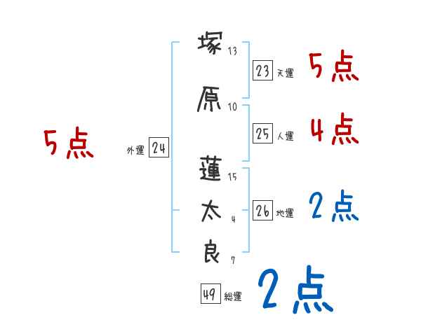 地運![]() | 塚原蓮太良さんの地運は26画の2つ星!波瀾万丈かも。信頼できる人を大事にしましょう。 個性を表す基礎的な運勢です。性格形成や対人関係、行動力など家庭環境に影響されます。主に誕生してから20歳くらいまでの若年期の運勢を表します。 |