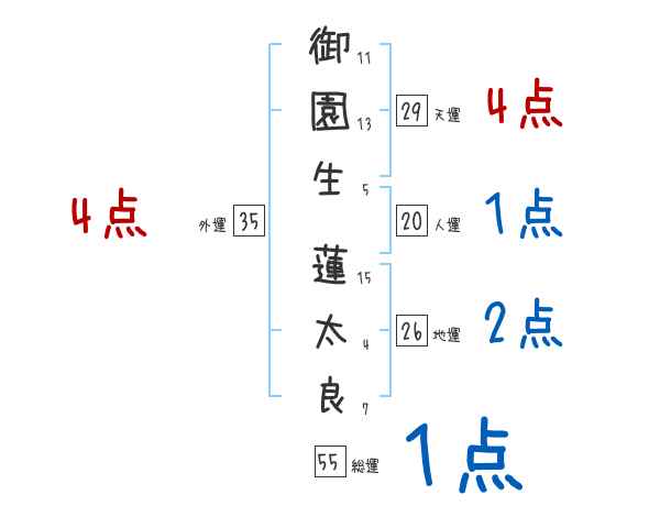 外運![]() | 御園生蓮太良さんの外運は35画の4つ星!温厚な性格で感受性が高い。穏和な性格で人望が厚い。 生活面を象徴する運勢です。外部から受ける影響力を表し、結婚運、家庭運や職場、環境への順応性を表します。 |
