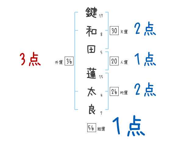 外運![]() | 鍵和田蓮太良さんの外運は36画の3つ星!先見性が豊かです。多少神経質で苦労することも。 生活面を象徴する運勢です。外部から受ける影響力を表し、結婚運、家庭運や職場、環境への順応性を表します。 |