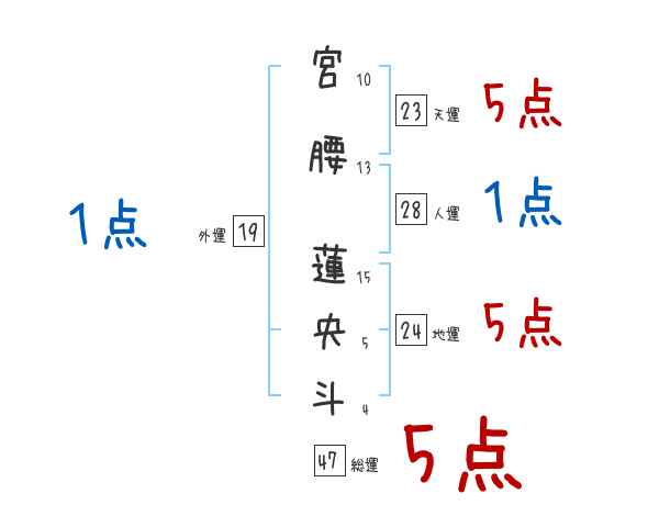 天運![]() | 宮腰蓮央斗さんの天運は23画の5つ星!想像力に優れ活力がある。一代で成功し名誉を手に入れる。 家系が持つ宿命的な運勢を表します。祖先から受け継いだ苗字ですので自分の力が及びません。家柄を象徴します。 |
