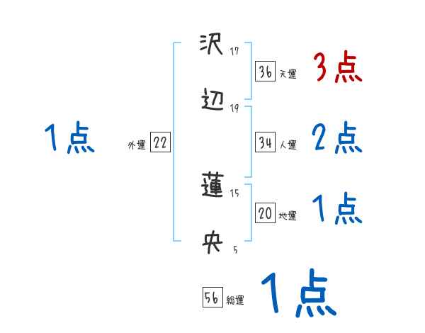 天運![]() | 沢辺蓮央さんの天運は36画の3つ星!先見性が豊かです。多少神経質で苦労することも。 家系が持つ宿命的な運勢を表します。祖先から受け継いだ苗字ですので自分の力が及びません。家柄を象徴します。 |