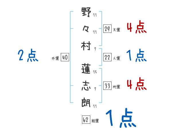 天運![]() | 野々村蓮志朗さんの天運は29画の4つ星!完全主義で才能がある。厳格な心の持ち主。 家系が持つ宿命的な運勢を表します。祖先から受け継いだ苗字ですので自分の力が及びません。家柄を象徴します。 |