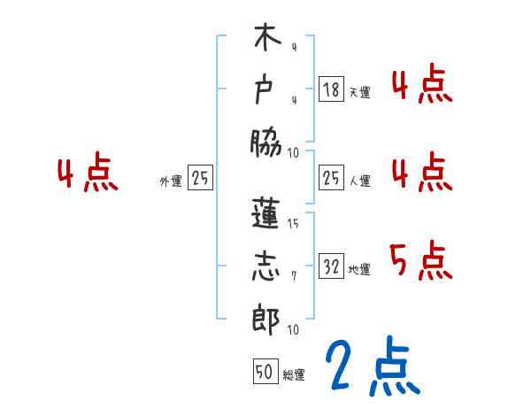 地運![]() | 木戸脇蓮志郎さんの地運は32画の5つ星!柔軟性があり成功する。チャンスが多く金運が良い。 個性を表す基礎的な運勢です。性格形成や対人関係、行動力など家庭環境に影響されます。主に誕生してから20歳くらいまでの若年期の運勢を表します。 |