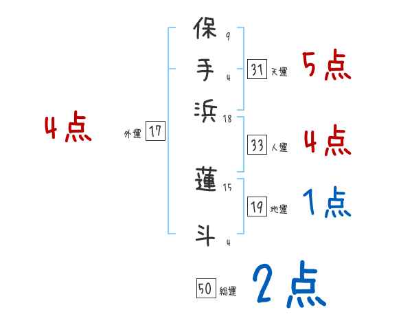 天運![]() | 保手浜蓮斗さんの天運は31画の5つ星!社交性があり判断力に優れる。順風満帆な人生で円満な生活。 家系が持つ宿命的な運勢を表します。祖先から受け継いだ苗字ですので自分の力が及びません。家柄を象徴します。 |