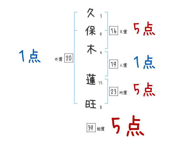 総運![]() | 久保木蓮旺さんの総運は39画の5つ星!社交性に優れ人望が厚い。人の上に立ち成功する。 あなたの人生を表す1番重要な運勢です。生涯を通じて影響する総合運となり、主に50歳以降の晩年期に影響を及ぼします。 |